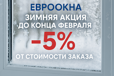 Компания «ЕвроОкна» приглашает воспользоваться зимней акцией — минус 5% от стоимости заказа до конца февраля. Предлагаем готовые пластиковые окна и окна ПВХ на заказ по выгодным ценам, с профессиональной установкой и гарантийным обслуживанием.
