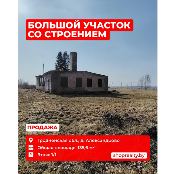 💼 Продается большой земельный участок с капитальным строением в д. Александрово, Обуховский с/с (12 км от Гродно, трасса М6). Площадь общая: 135,6 кв.м‍‍‍ Участок: 118,8 соток Год постройки: 1963 Высота потолков: 3,59 м Этаж: 1/1 ✅ Земельный участок предназначен для строительства и обслуживания зданий и сооружений. 🌳 Участок ровный, прямоугольной формы, находится в аренде. 🏢 Капитальное строение: фундамент — бетон, стены и перегородки — кирпич, перекрытия — ж/б панели, кровля — совм. рулонная, полы — доска. 🚰 Коммуникации: 🔸 вода: центральная 🔸 газ: проходит по периметру участка 🔸 канализация: выгребная яма 🔸 электричество: 200 кВт 💰Стоимость: $100 000 / 283 280 р. НДС: 0 % *стоимость указана на момент публикации и может меняться‍‍‍ Смотрите подробнее на нашем сайте — https://shoprealty.by/catalog/bolshoj-zemelnyj-uchastok-v-1-1879-ga-s-kapitalnym-stroeniem-ploshhadyu-135-6-kv-m/ Номер договора: 91/7/2026 от 16.03.2026 ‍‍‍ 👩🏼 Риэлтер: Дарья 📞 Звоните +375(29) 787-96-82 (Viber, WhatsApp, Telegram)‍‍‍ Магазин Недвижимости:‍‍‍ 📲 VIBER / WhatsApp / Telegram‍‍‍ ☎️ +375(29) 596-76-76‍‍‍ ☎️ +375(33) 398-76-76 ☎️ +375(44) 596-76-76‍‍‍ ☎️ +375(152) 68 -76-76 📍 Гродно, пр-т Янки Купалы, 20 📍 Гродно, ул. Тимирязева, 10/1, офис 2 (БЦ «Августовский», 1 этаж) 📍 Гродно, ул. Захарова, 30 ‍‍‍ ООО «Магазин недвижимости», УНП 591026293, лицензия № 02240/352 от «24» октября 2017 года