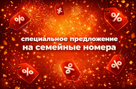 Дополнительная выгода на отдых — 15% скидка на путёвки «Лечение», «Оздоровление» и «Wellness» при заезде в номера категории "Двухкомнатный семейный" спального корпуса №5.